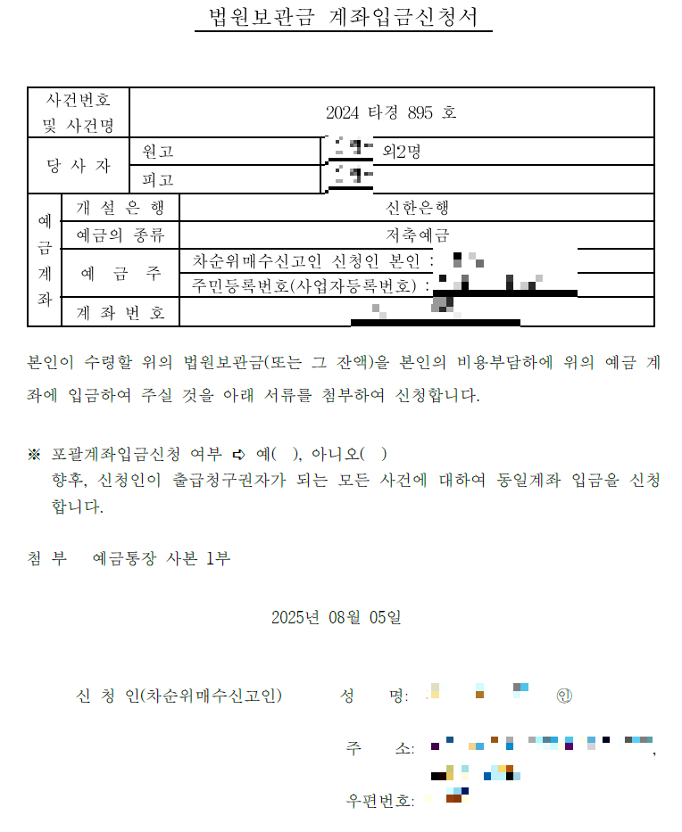 기름쟁이가 직접 작성한 법원보관금 계좌입금 신청서입니다.
