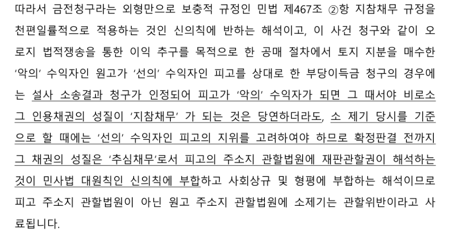 핵심 내용으로는 "채권의 이행 장소는 특별한 약정이 없으면 채권자의 현주소를 변제 장소로 한다" 따라서 원고의 주소지 관할 법원에서 부당이득금 청구 소송을 진행하는 것이 맞다는 것을 주장하였습니다. 소송을 진행할 때는 관련 법률 및 판례에 근거하여 주장을 하는 것이 가장 중요합니다.