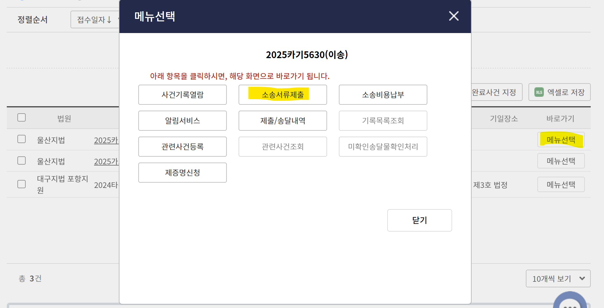나의 사건에서 해당 사건번호의 메뉴선택 - 소송서류제출을 선택합니다.