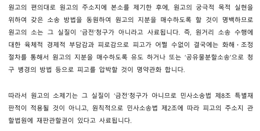 원고는 부당이득금 지료 청구가 본 목적이 아니라 지분 매수를 유도하기 위한 소송일 뿐 본질은 공유물 분할에 있으니 금전 청구인 원고 주소지 관할 법원이 아닌 일반적인 소송 관할 법원과 같이 피고의 주소지 관할 법원으로 이송하여야 한다.