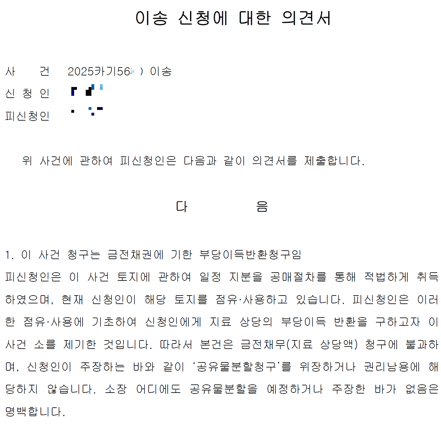 부당이득금 산정에 대한 답변서를 적은 것이 아니라 사건의 관할 법원 이송에 대한 내용을 적었습니다.