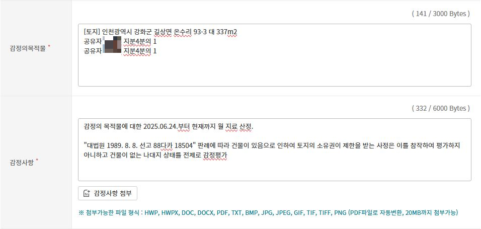 감정신청서의 내용 중 신청취지, 감정의 목적을 입력합니다.