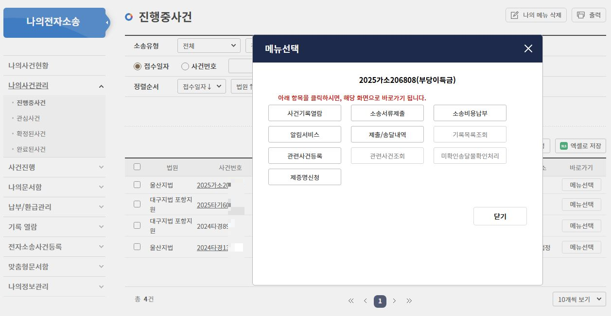 해당사건 메뉴의 소송서류제출을 선택합니다.