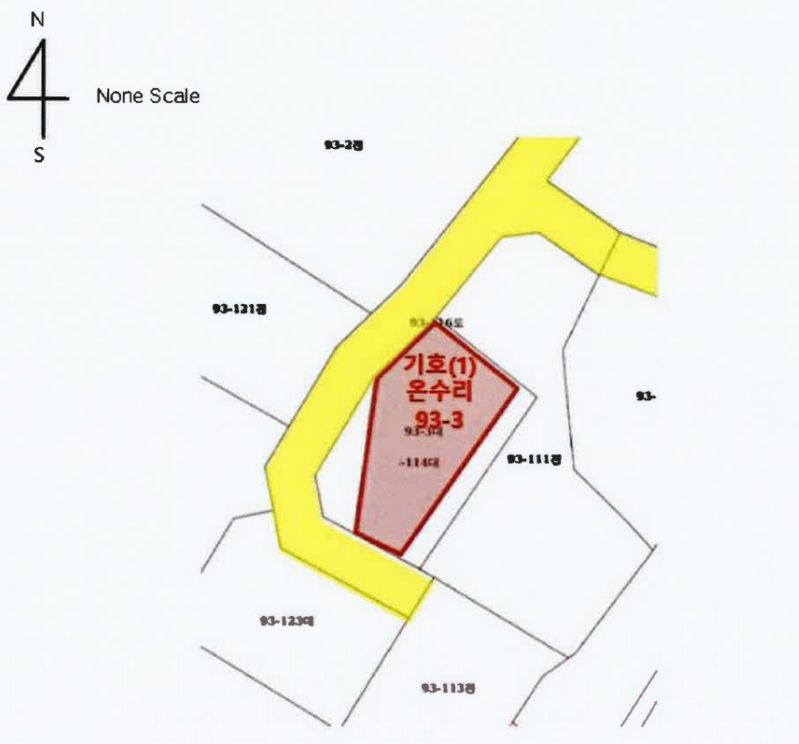 기름쟁이가 낙찰받은 토지 지분은 93-3번지입니다. 하지만 해당 토지 주변으로 93-114번지 토지가 둘러싸고 있는 형태이니 지적도상 맹지가 맞습니다.