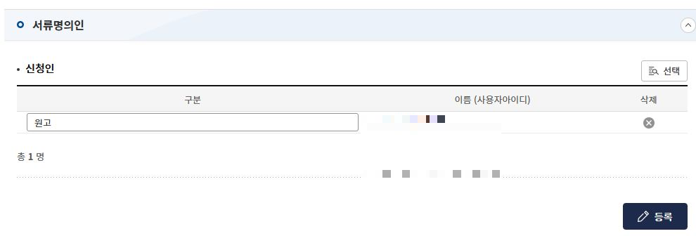 서류명의인은 원고를 선택하고 서류 제출을 하시면 됩니다.